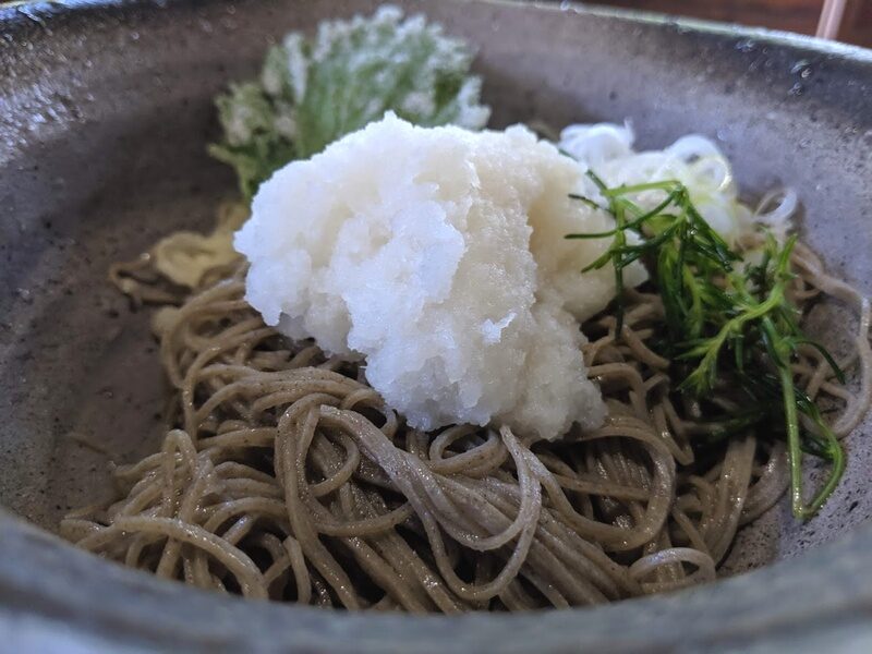 おろし蕎麦をいただきました。この器がまたすごく存在感あります。珠洲焼の作家物のようですが、このように実際に食に供されるとはぜいたくですね。