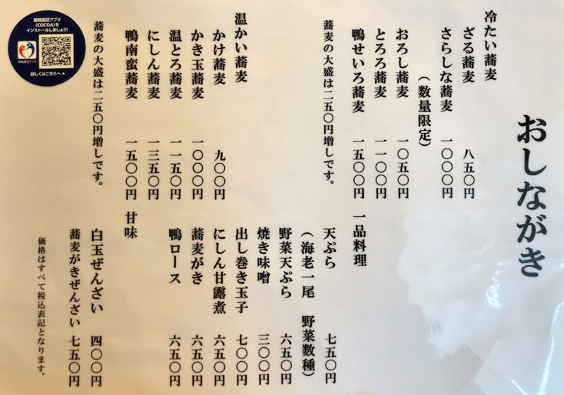 ざる蕎麦を大盛りにしていただきました。ざる蕎麦は850円で、大盛りは250円増しなので、合計1100円でした。支払いはPayPayが使えました。いまのところキャッシュレス支払いはPayPayのみのようです。